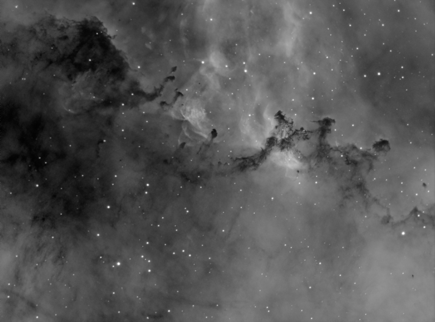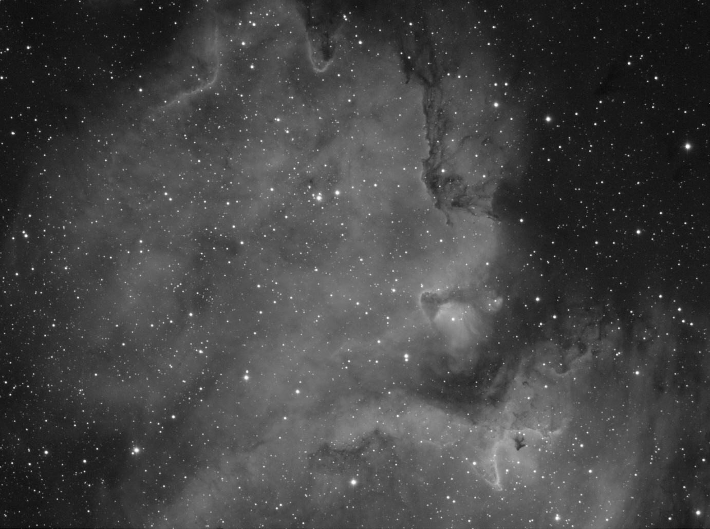 Les dentelles du cygne sont les restes d'une supernova qui a explosé il y a approximativement 10.000 ans. Elles s'étendent sur un champ environ 10 fois plus large que celui de cette photo. Image faite avec un filtre H-alpha 6nm, avec 23 poses de 7 minutes.