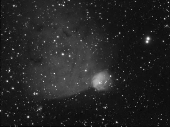 La nébuleuse de la Grande Citrouille Sh2-235 est un nébuleuse d'hydrogène assez faible, d'un diamètre un peu supérieur à la pleine Lune. Photo prise à la lunette en H-alpha.