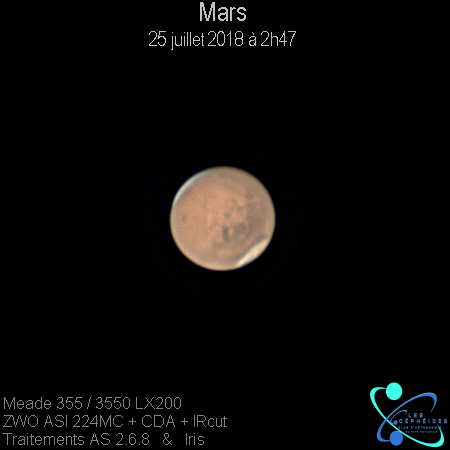 Comme la planète rouge était très basse pour cette opposition de 2018, il a fallu investir dans des technologies récentes, la ZWO ASI 224MC, et le correcteur de dispersion atmosphérique ZWO, pour pouvoir exploiter correctement le Meade 355/3550 de Royan. De plus, une gigantesque tempête de poussière a masqué tous les détails. Cette photo a été prise au moment où la poussière commençait tout juste à tomber.